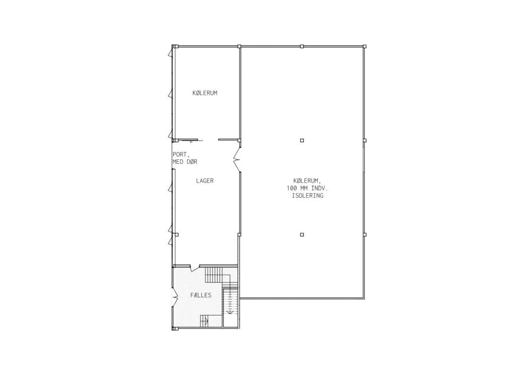 Lager og kølerum udlejes i ejendom. Lejemålets formål er rent lager – enten køl- eller normal lageropbevaring. Lagerarealerne opvarmes med ejendommens centralvarme i form af radiatorer.